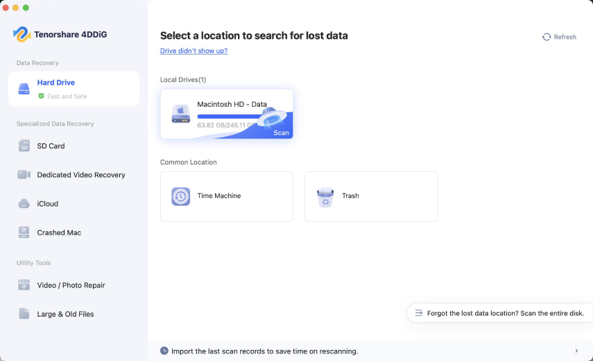 Download and install the 4DDiG Mac Data Recovery on your Mac. Open the application and choose the drive from which the files were lost.