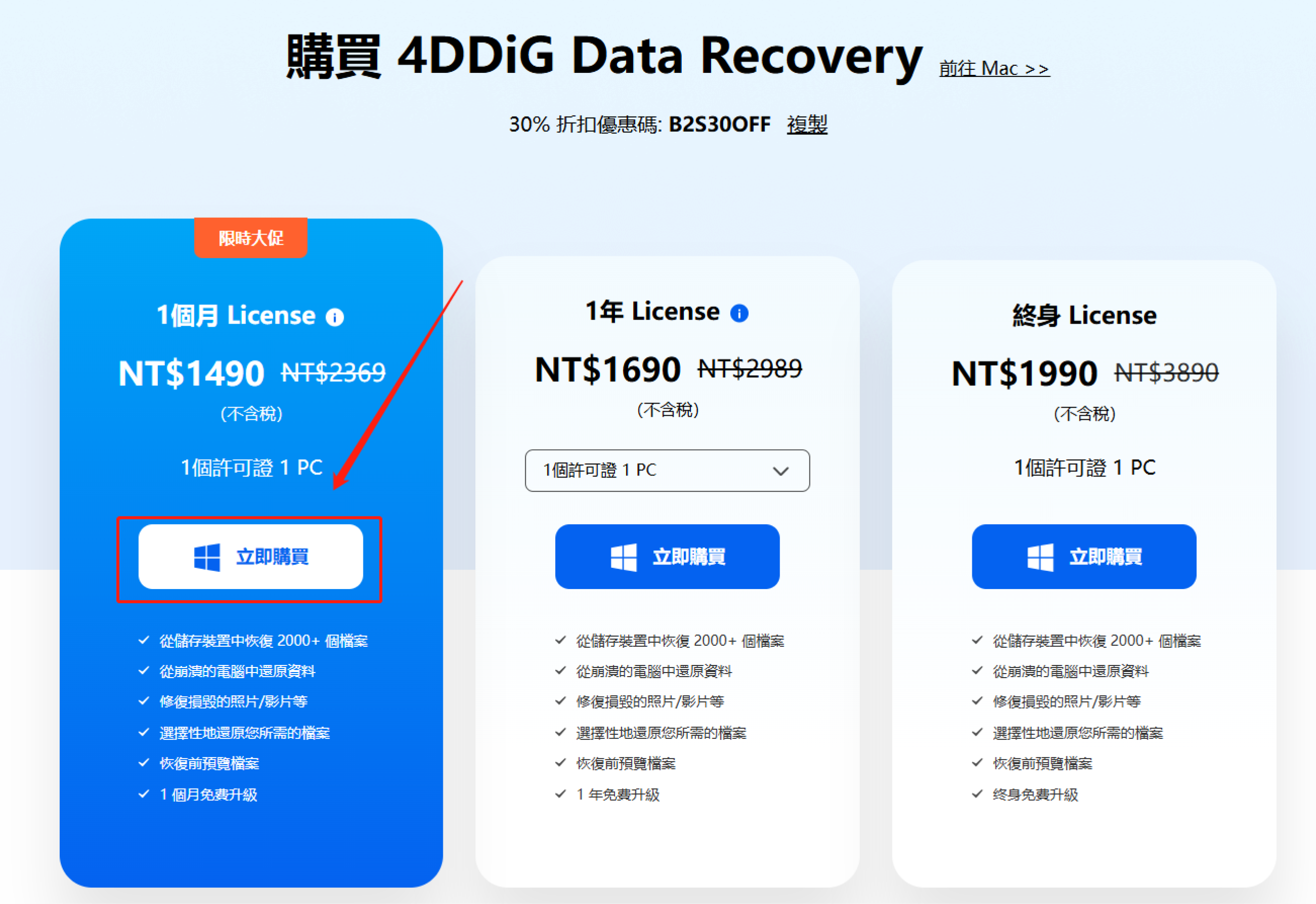 4DDiG的註冊碼無法跨平台使用。因此,請確保所購買的許可碼與您的操作環境相符。如果您不小心購買了不適用的版本,請隨時聯絡我們的客服尋求協助。