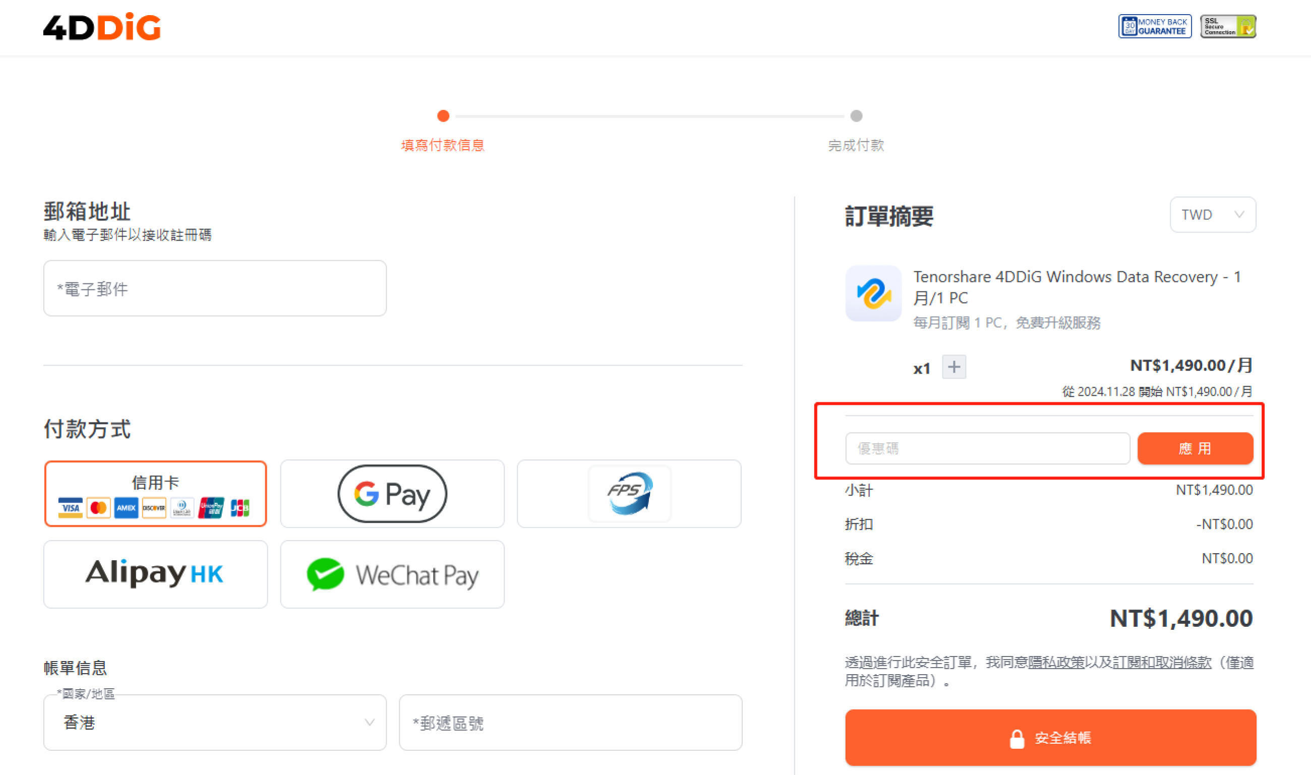 是的,您可以放心購買 Tenorshare 4DDiG 資料救援軟體,100% 安全保證。