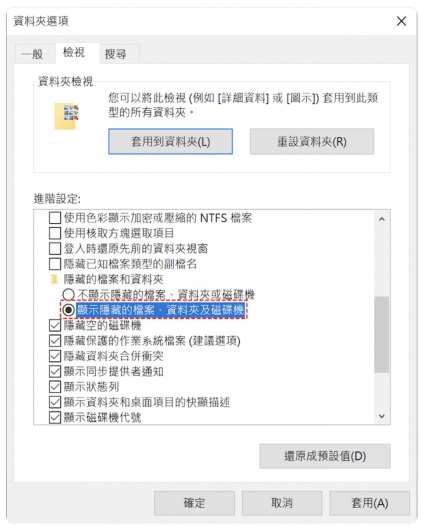 點選「檢視」標籤,在「隱藏檔案和資料夾」中,勾選「顯示隱藏的檔案、資料夾和磁碟機」然後點擊「套用」和「確定」,再查看是否已成功救援之前讀不到的資料。