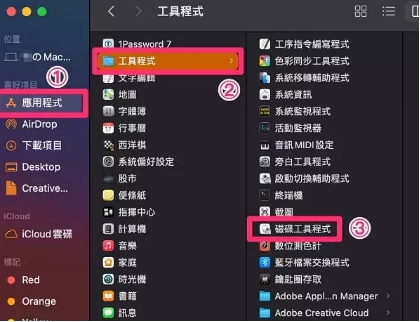 打開 “Finder” > “應用程式” > “工具程式” > 然後選擇 “磁碟工具程式”