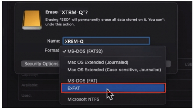 選擇 FAT32(32GB 或更小容量)或 exFAT(64GB 或更大容量)作為新的 SD 卡格式。