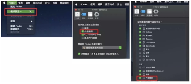 - 退出記憶卡後,在 MacBook 上找到「Finder」,點擊「偏好設定」。
