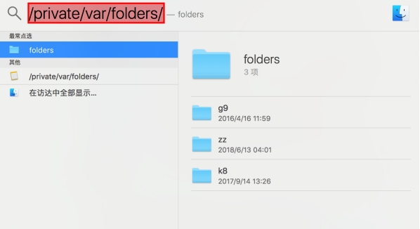 打開 Finder,按快捷鍵 Command + Shift + G,輸入以下目錄:/private/var/folders