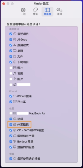 - 在「一般」和「側邊欄」選項卡中,確保「外接磁碟」已勾選。