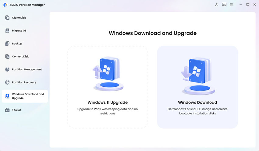啟動 4DDiG Partition Manager,點擊「Windows 下載與升級」,選擇「Windows 下載」。