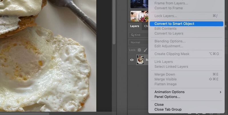 前往 「圖層」面板,點擊右上角的 選單圖示(三條線),然後選擇 「轉換為智能對象」。