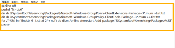 - 將此文件保存為 fixgpedit.bat。以系統管理員身份運行 fixgpedit.bat 檔案。並等待腳本執行完成,然後重啟電腦。再次嘗試開啟 gpedit.msc。