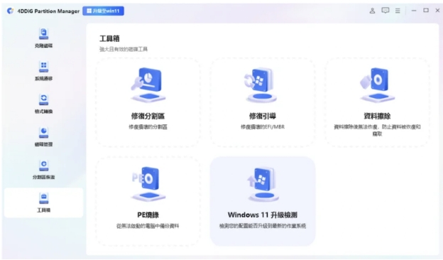 下載並安裝 4DDiG Partition Manager。點選左側的「工具箱」>「Windows 11 升級檢測」。