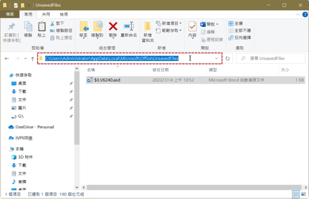 找到檔案保存的路徑,例如:C:\Users\Username(Administor)\AppData\Local\Microsoft\Office\UnsavedFiles。然後複製想要復原的Word 檔案的檔案名。