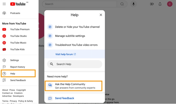 登入您的頻道,在左側功能選單中向下滑動到頁面底部,然後點擊「協助」>「需要更多協助?」> 「詢問協助社群」。