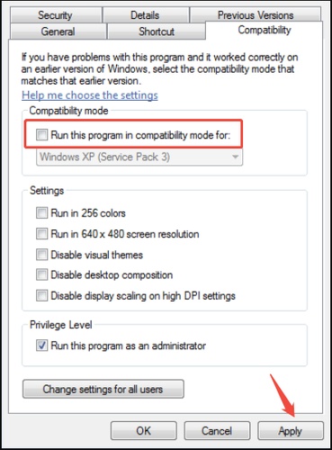 Right-click the browser icon and go to "Properties", then open the "Compatibility" tab and uncheck the "Run this program in compatibility mode" option, then click "Apply”.