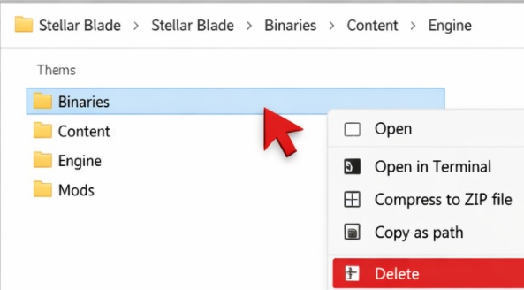 Navigate to your Stellar Blade installation directory. Locate the Binaries folder and delete it entirely.