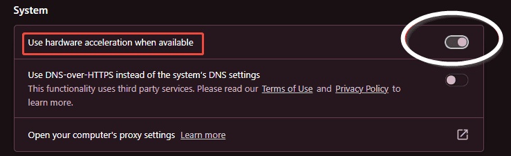 Navigate to System in the left sidebar. In the System section, you'll find an option labeled “Use graphics acceleration when available ”. Click the toggle switch to disable it, then the hardware acceleration is turned off.
