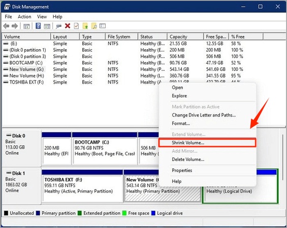 Press Win + X > Disk Management. Right-click your main drive (C:) and choose Shrink Volume.