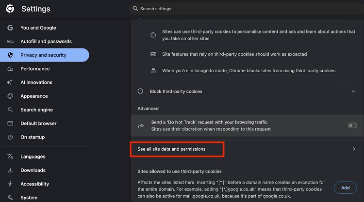Open Chrome or Edge and click the three-dot menu, then go to "Settings” and choose “Privacy and security” and open “Third-party Cookies”.